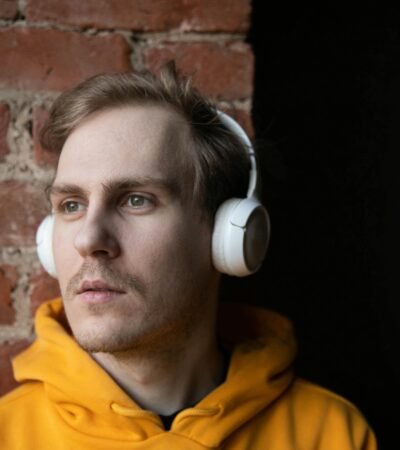 A smartphone displays a YouTube video in front of a portable speaker. The phone features a music playlist on the screen, and both the phone and speaker rest on a surface covered with a reddish-brown cloth. The background is softly blurred, emphasizing the devices.